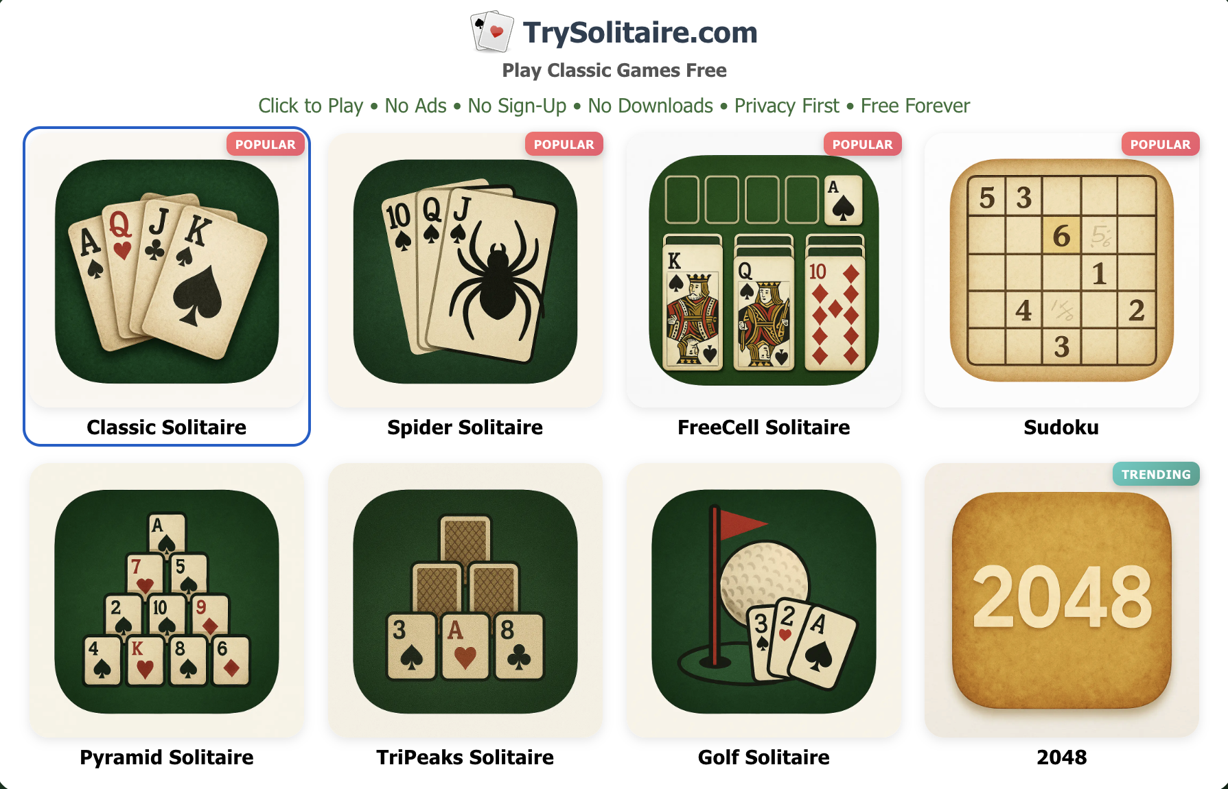 I was disappointed with the gaming sites and wanted to build something clean which focused on the playing experience over ads, leaderboards, analytics, stealing private info etc. trySolitaire.com is the product of my disappointment with other solitaire sites and my humble attempt at providing the gaming community with the playing experience befitting a true classic.